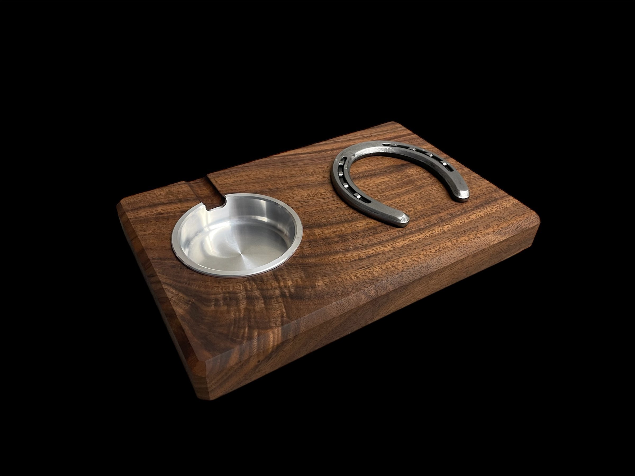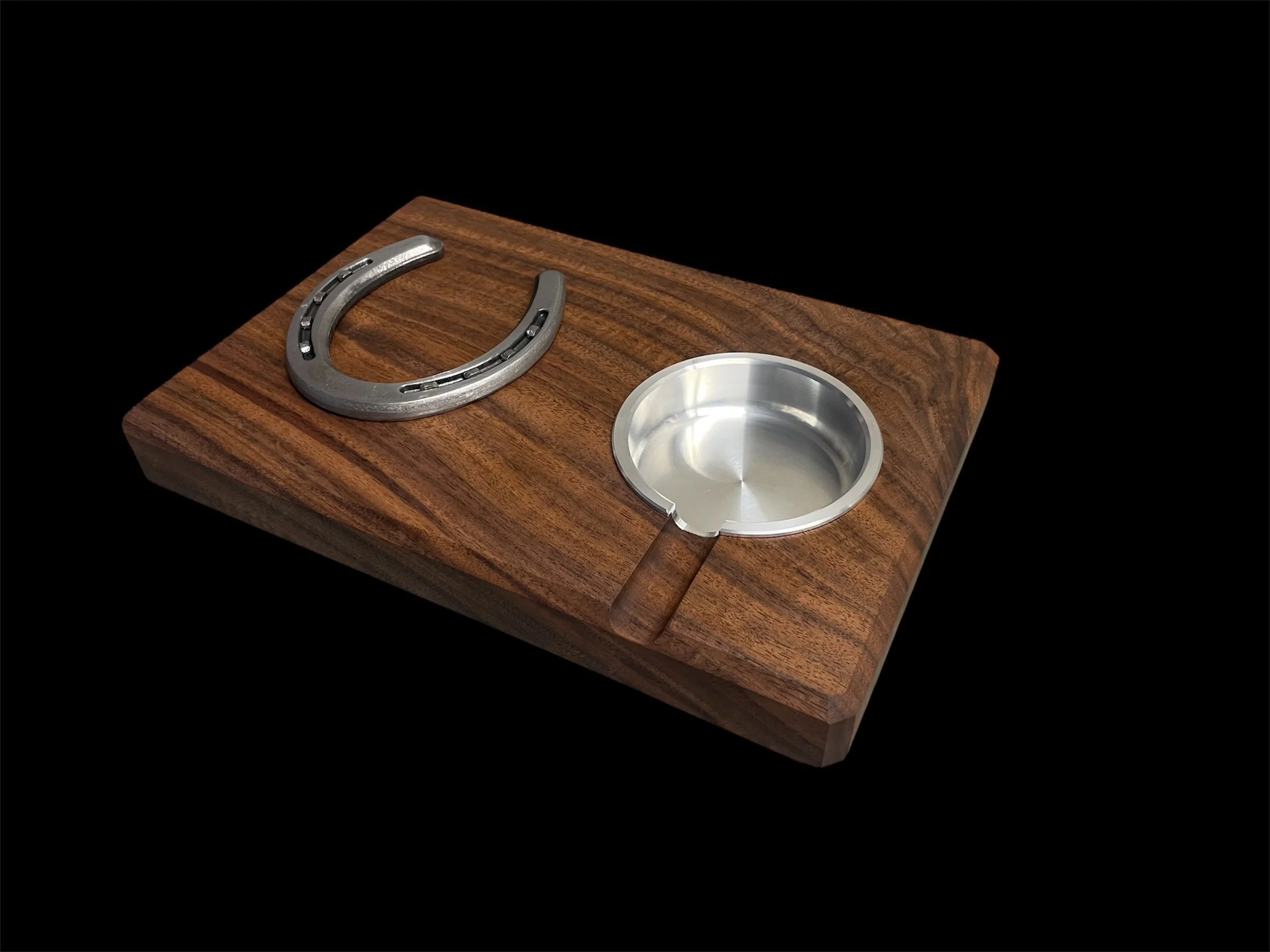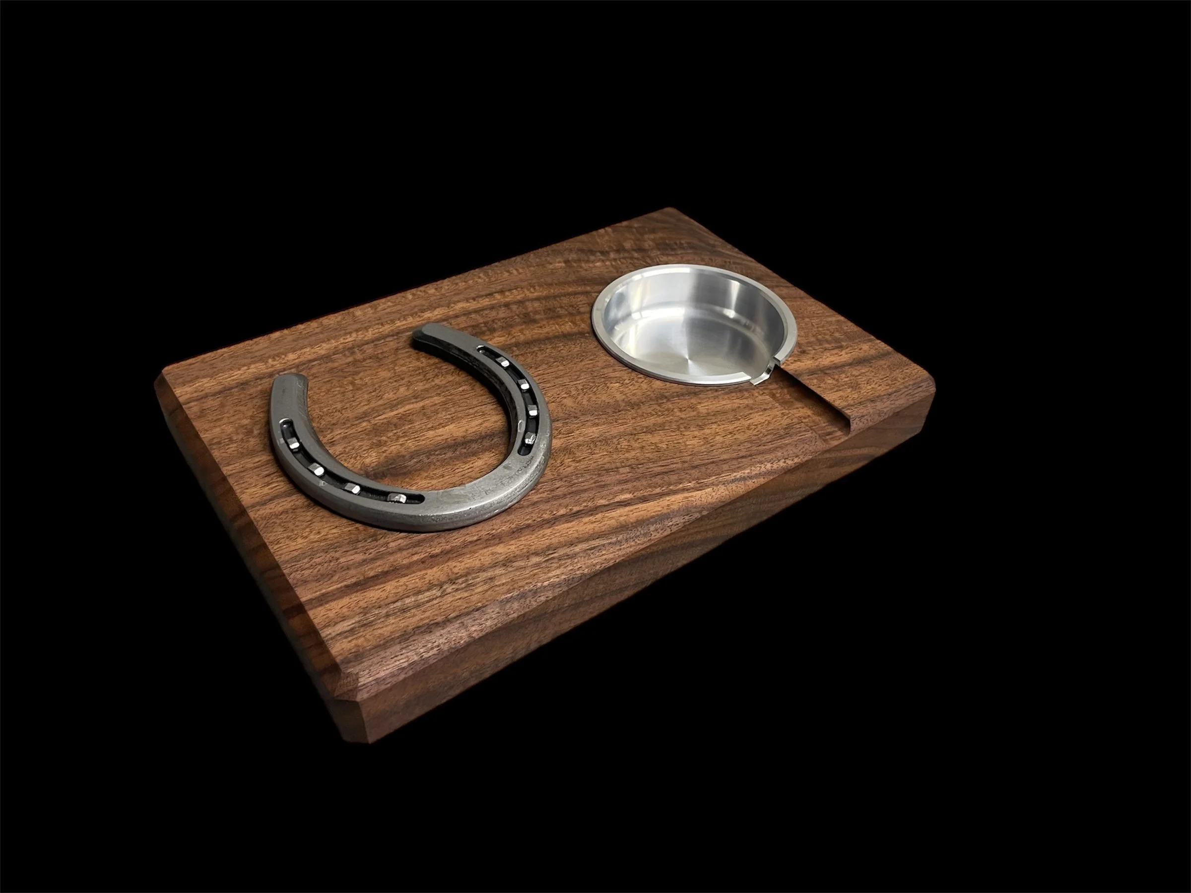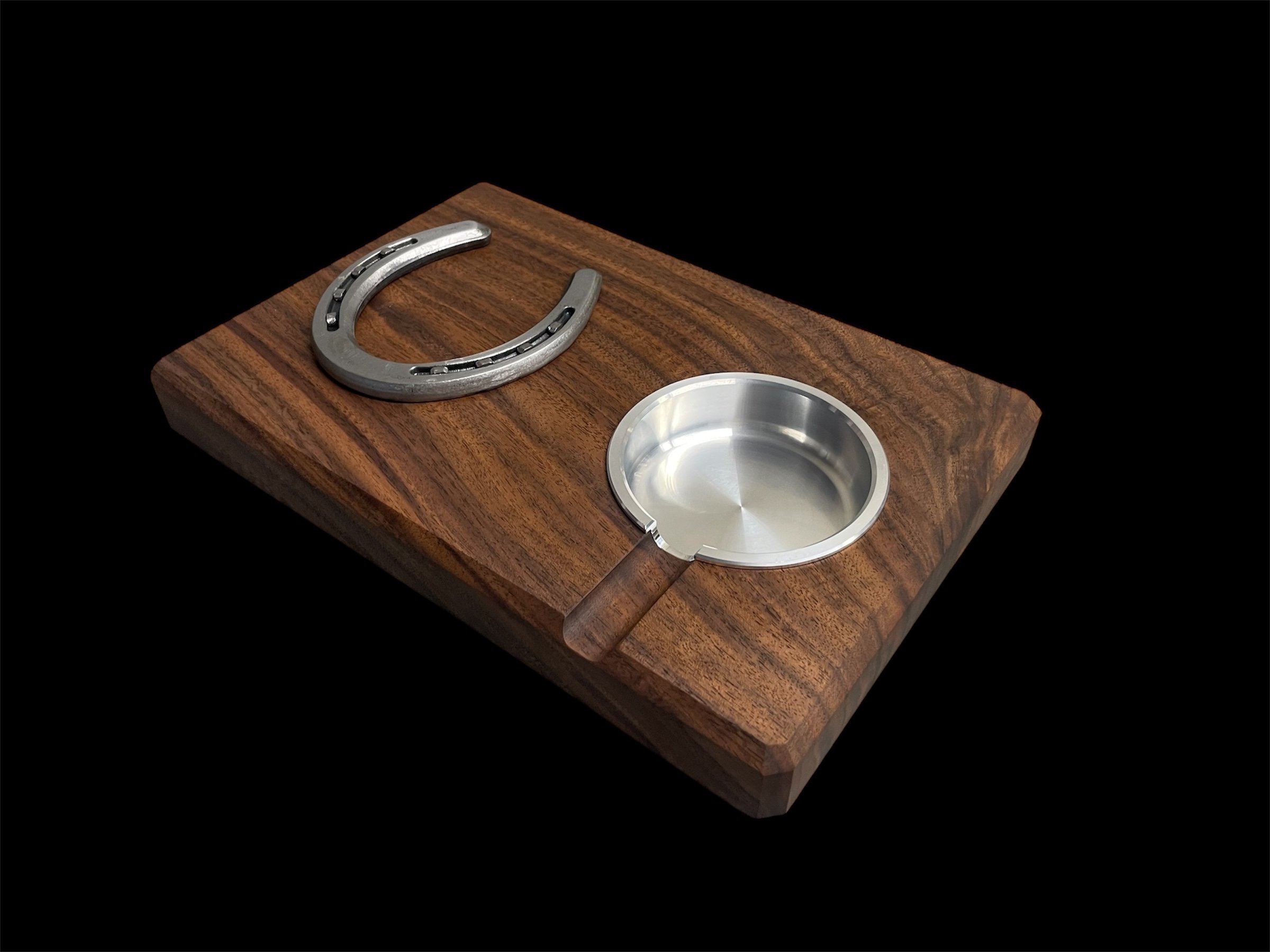 Discover the ideal blend of style and function with our walnut cigar ashtray and horse shoe coaster set. The ashtray, featuring grooves for secure cigar placement, showcases the natural beauty of walnut wood. Meanwhile, the horse shoe adds a rustic charm. Perfect for cozy nights or entertaining, this set elevates your ambiance and reflects your refined taste. Enhance your cigar and spirit experience with this sophisticated duo.